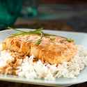 2 tsp. (2 cloves) minced garlic 2 green onions, sliced (about 1/4 c.) 1 Tbsp. olive oil 1/2 c. dry white wine 3 Tbsp. tomato paste 1-1/2 Tbsp. garam masala (or sweet curry powder) 1 tsp. sea salt 1 can (15 oz.) regular or light coconut milk 4 Alaska Cod fillets (6 to 8-oz. ea.), fresh, thawed or frozen 4 c. cooked jasmine/brown rice or stir-fry vegetables