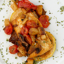 15-inch sheet of parchment paper 1/2 lemon, sliced 5 oz. mahimahi fillet 1/2 Tbsp. butter 1/2 Tbsp. olive oil pinch salt and pepper 1 small Yukon Gold potato, chopped 1/4 c. cherry tomatoes, chopped 1/4 c. mushrooms, chopped 1 twig parsley 1 twig oregano steamed brown rice (optional)